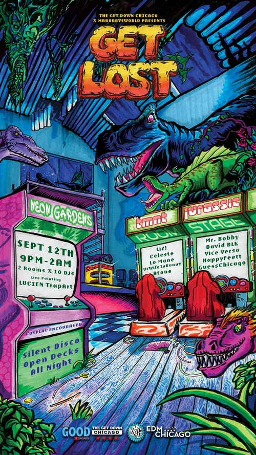 The Get Down Chicago x MrBobbysWorld Presents GET LOST at Neon Gardens, Chicago. Hand-illustrated flyer based off the Jurassic Park Pop-Up held at the venue.