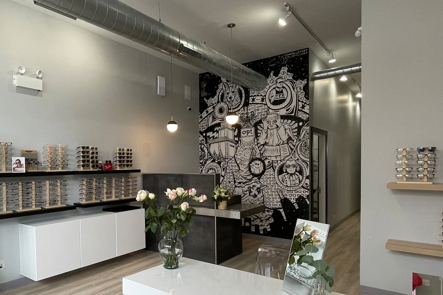 Mural in collaboration with artist Tom Molloy for OPT Vision Studio in the Jefferson Park neighborhood of Chicago.
