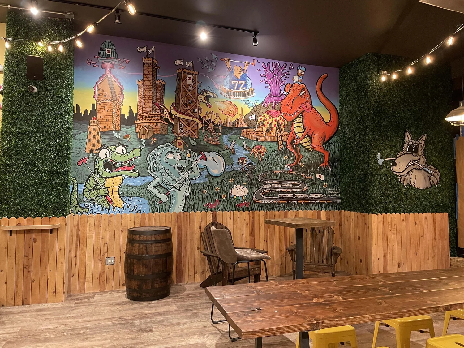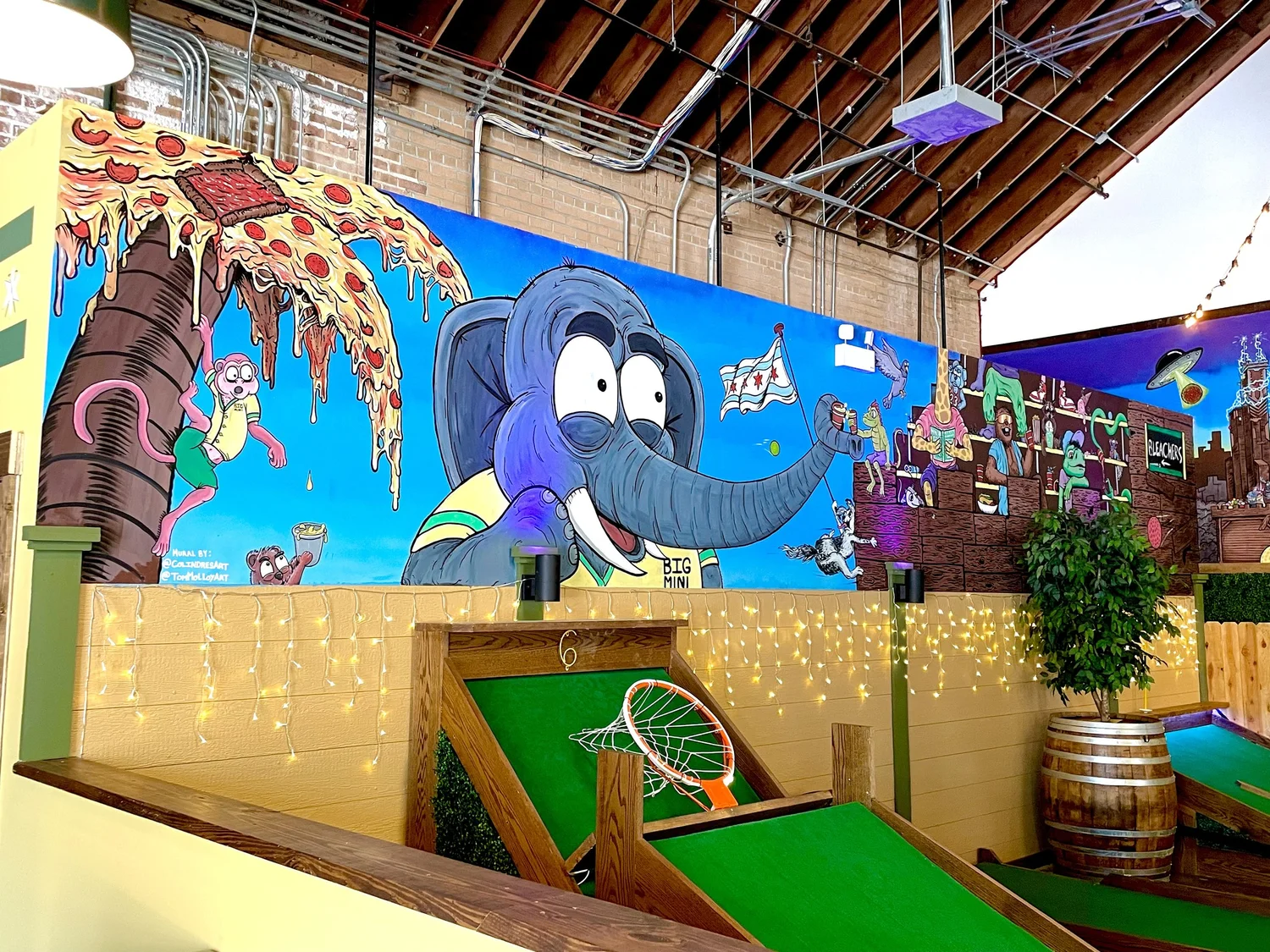 Small-scale mural painted by me for Big Mini Putt Club located in the Wicker Park neighborhood of Chicago.  Laser-cut character design by Tom Molloy. Cut by Mario Peña.